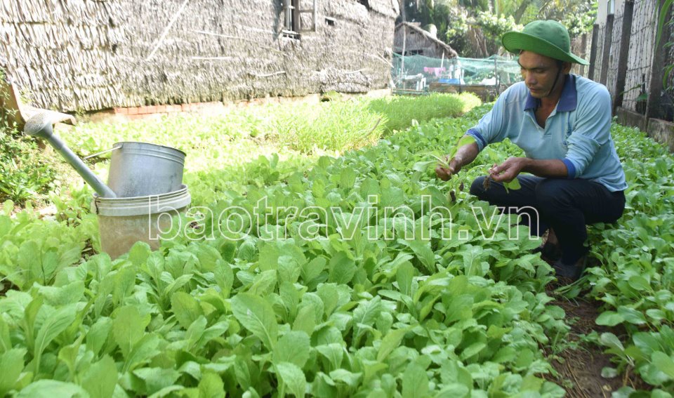 Nhờ nguồn vốn vay 10 triệu đồng từ Phòng Giao dịch Ngân hàng Chính sách xã hội huyện mà gia đình ông Thạch Châu Tính, ấp Trà Cuôn, xã Kim Hòa có vốn đầu tư nuôi heo sinh sản, heo thịt và tận dụng diện tích xung quanh nhà trồng rau cải ngắn ngày tăng thêm thu nhập trang trải cuộc sống hàng ngày.