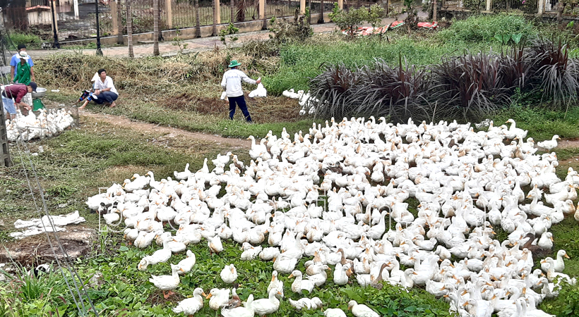 Nông dân xã Hiếu Tử, huyện Tiểu Cần xuất bán vịt thịt cho thương lái.