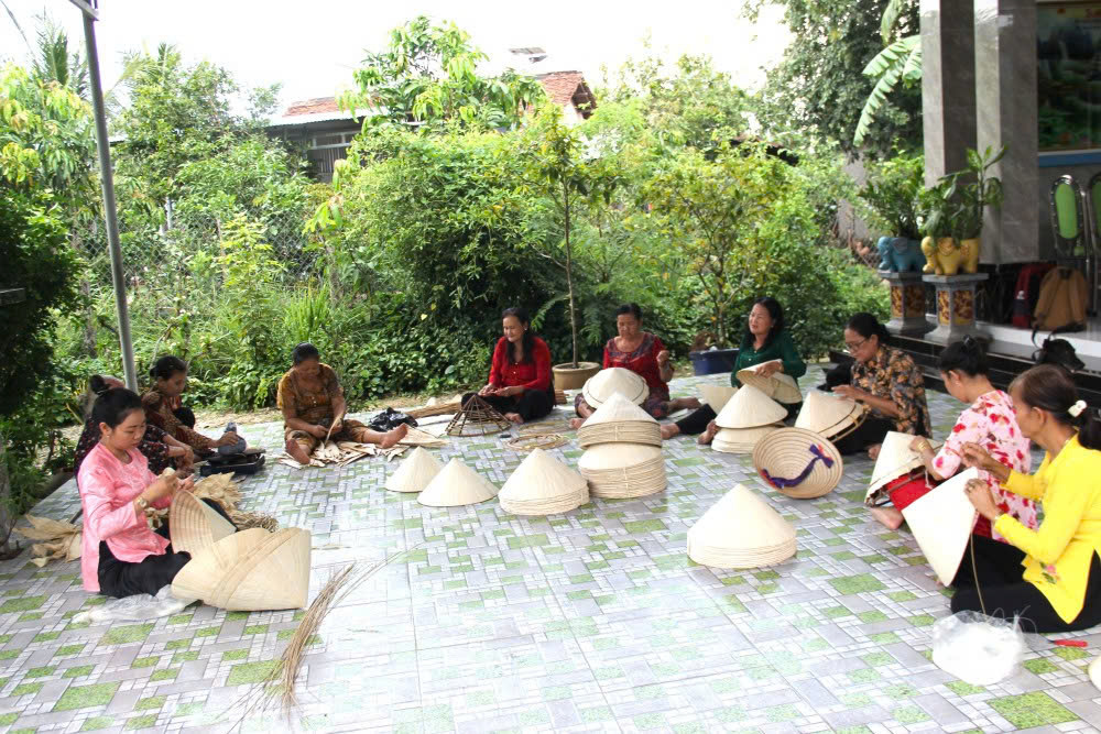 Phụ nữ xã An Ninh cùng nhau chằm nón lá, giữ gìn nghề truyền thống và tăng thêm thu nhập lúc nông nhàn