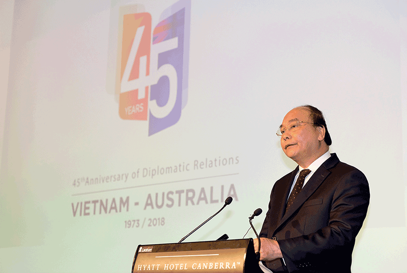 Trong khuôn khổ chuyến thăm, Thủ tướng Nguyễn Xuân Phúc và Toàn quyền Australia Peter Cosgrove đã đồng chủ trì lễ kỷ niệm 45 năm thiết lập quan hệ ngoại giao Việt Nam – Australia. Phát biểu tại đây, Thủ tướng chia sẻ, trải qua thăng trầm của lịch sử, ngày nay, Việt Nam và Australia là bạn, là Đối tác chiến lược của nhau. Người dân Việt Nam biết đến và đồng cảm với đất nước, con người Australia qua các bộ phim hấp dẫn như “Tất cả các dòng sông đều chảy”, “Người đàn ông trên dòng sông băng” và tiểu thuyết văn học nổi tiếng “Tiếng chim hót trong bụi mận gai”. Về phía mình, Toàn quyền Peter Cosgrove khẳng định: “Australia tự hào có một người bạn là Việt Nam”. Nhân dịp này, Toàn quyền Peter Cosgrove đã đích thân lái xe điện đưa Thủ tướng Nguyễn Xuân Phúc và Phu nhân thăm vườn thú kanguru trong khuôn viên Phủ Toàn quyền, một cử chỉ hữu nghị đặc biệt thể hiện sự coi trọng của Australia dành cho Việt Nam.