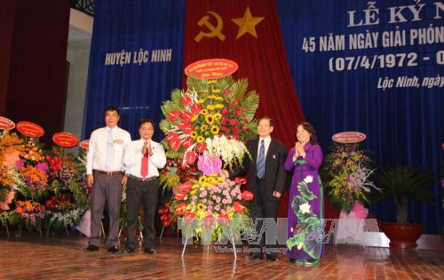 Phát biểu tại lễ kỷ niệm, Bí thư Tỉnh ủy Bình Phước Nguyễn Văn Lợi đánh giá cao những nỗ lực của quân và nhân dân huyện Lộc Ninh trong công cuộc xây dựng và phát triển kinh tế - xã hội từ sau giải phóng đến nay. Theo Bí thư Tỉnh ủy Bình Phước, Lộc Ninh là huyện biên giới có vị trí chiến lược quan trọng, kinh tế - xã hội còn nhiều khó khăn. Vì vậy, các cấp, các ngành cần hết sức quan tâm, tạo mọi điều kiện để hỗ trợ huyện Lộc Ninh phát triển tương xứng với tầm vóc lịch sử của địa phương./.