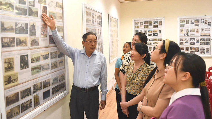 Ông Nguyễn Đại Hùng Lộc thuyết minh cho các bạn trẻ về những tấm bưu ảnh trăm năm tái hiện hành trình Nguyễn Ái Quốc - Ảnh: Tự Trung