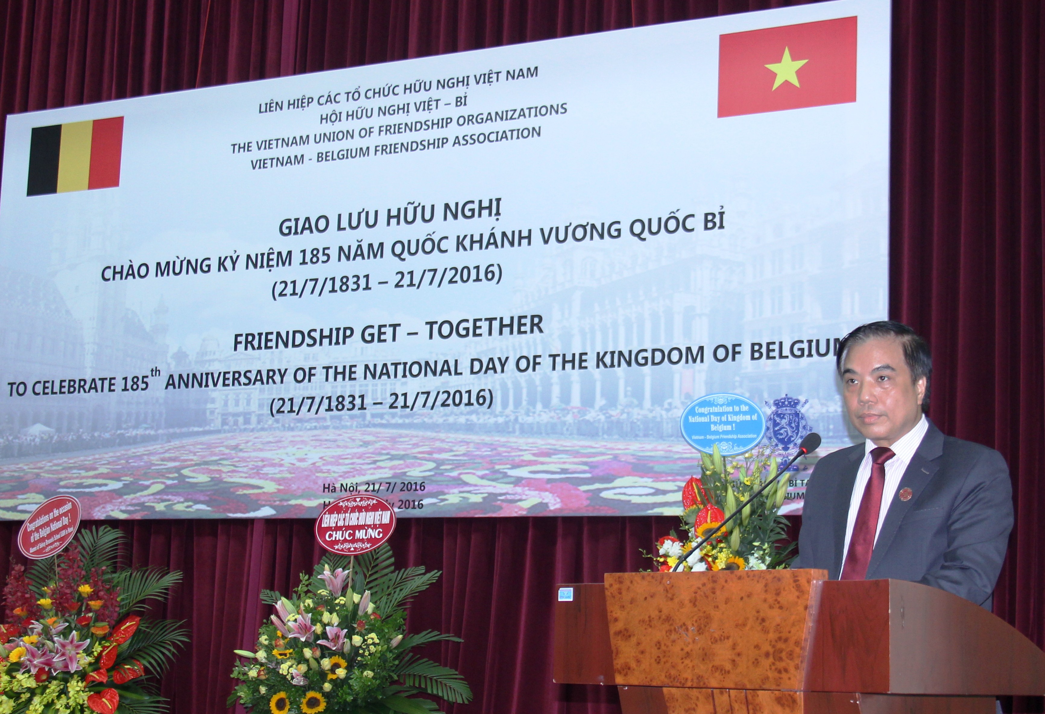 Phát biểu khai mạc chương trình giao lưu, thay mặt Hội hữu nghị Việt – Bỉ, ông Bùi Anh Tuấn, Hiệu trưởng Trường Đại học Ngoại Thương, Phó Chủ tịch Hội đã gửi lời chúc tốt đẹp nhất tới Đại sứ Vương quốc Bỉ tại Việt Nam cũng như tới toàn thể nhân dân Vương quốc Bỉ nhân dịp kỷ niệm 185 năm ngày Quốc khánh; đồng thời cho biết, chương trình gặp mặt kỷ niệm nhân dịp Quốc khánh Vương quốc Bỉ là một hoạt động thường niên, rất có ý nghĩa của Hội hữu nghị Việt - Bỉ, đây là dịp để những người yêu mến nước Bỉ được giao lưu, trao đổi thông tin, tìm kiếm cơ hội hợp tác, đồng thời góp phần tích cực cho việc thúc đẩy quan hệ hữu nghị, hợp tác về mọi mặt giữa Chính phủ và nhân dân hai nước.