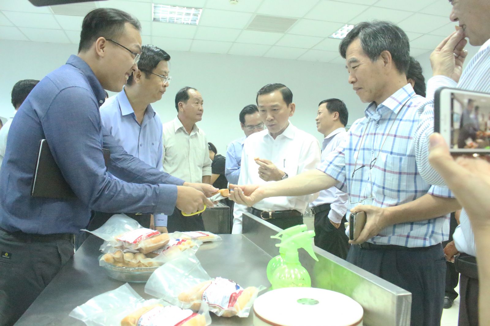 Lãnh đạo thành phố dùng thử sản phẩm xúc xích cá do Vườn ươm nghiên cứu và sản xuất. Ảnh: MINH HUYỀN
