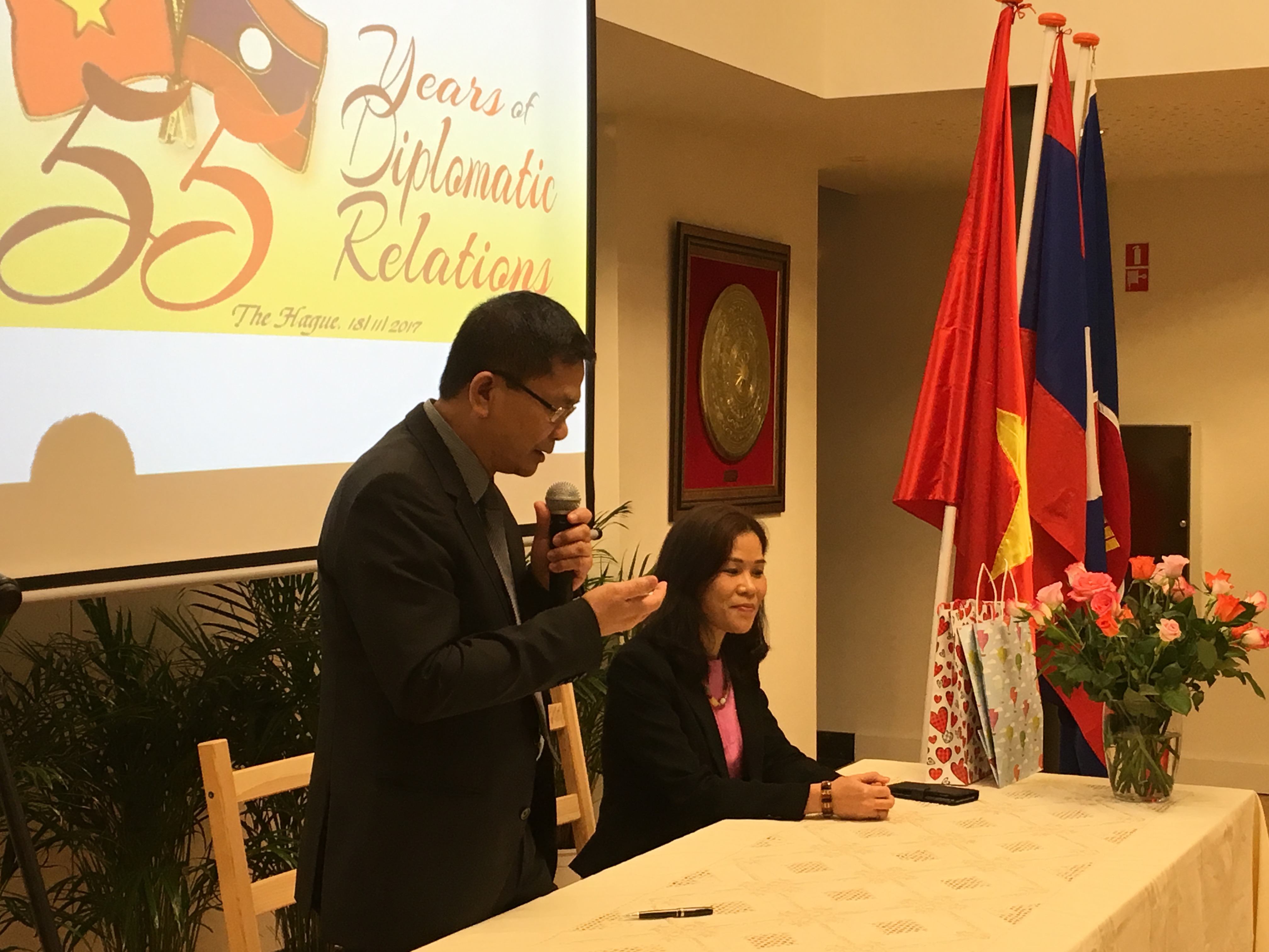 Thay mặt Đại sứ quán Lào, Đại sứ Khamkheuang Bounteum bày tỏ vui mừng được tới thăm và giao lưu với Đại sứ quán Việt Nam tại Hà Lan. Đại sứ Khamkheuang Bounteum ôn lại chặng đường lịch sử đấu tranh giành độc lập cùng quá trình xây dựng và phát triển của Cộng hoà dân chủ nhân dân Lào; nhấn mạnh quan hệ đoàn kết, liên minh chiến đấu Việt Nam - Lào, sự phối hợp, giúp đỡ vô tư giữa hai nước, hai dân tộc là nhân tố quan trọng làm nên thắng lợi của cách mạng mỗi nước, tiến tới giành thắng lợi hoàn toàn vào năm 1975.