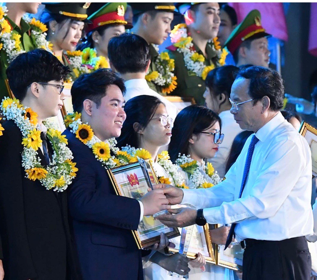 | Bí thư Thành ủy TP Hồ Chí Minh Nguyễn Văn Nên chúc mừng các cá nhân được tuyên dương "Sinh viên 5 tốt" cấp Trung ương năm học 2022-2023. (Ảnh: Việt Dũng) |