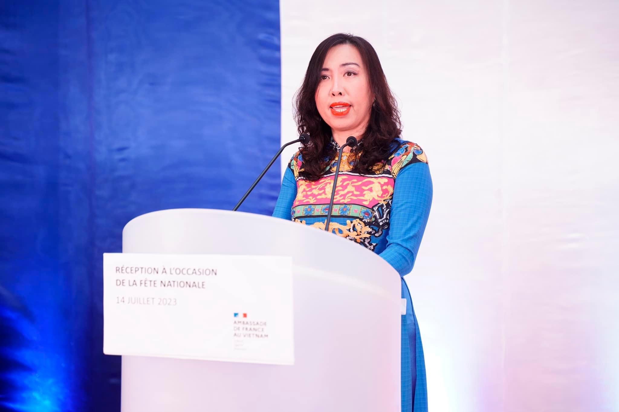 Đến dự và phát biểu tại Lễ kỷ niệm mừng Quốc khánh Pháp, Thứ trưởng Bộ Ngoại giao Việt Nam Lê Thị Thu Hằng thay mặt Chính phủ và nhân dân Việt Nam gửi lời chúc mừng tới Chính phủ và nhân dân Pháp.