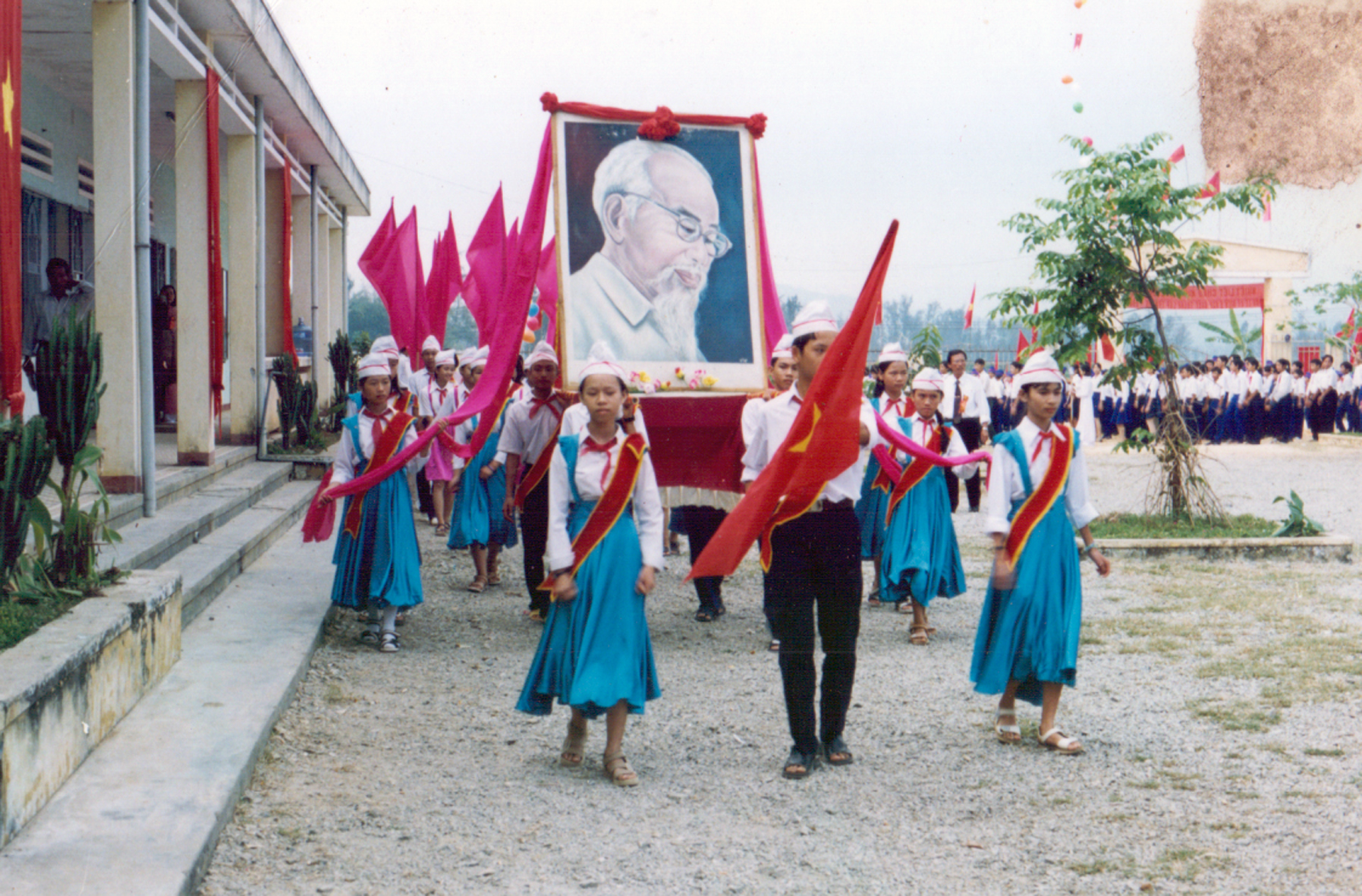 Những tháng ngày sau cuộc Tổng tiến công và nổi dậy mùa xuân 1975 của quân và dân ta vẫn còn bừng bừng sục sôi. Con đường làng cát trắng, quốc lộ 1A những con đường mà tôi đi qua mỗi ngày từ nhà đến trường hôm đó thật rực rỡ bởi những sắc cờ, băng rôn, khẩu hiệu, áp phích căng lồng trong gió. “Nước Việt Nam hòa bình, thống nhất, độc lập muôn năm!”, “Hồ Chủ tịch vĩ đại sống mãi trong sự nghiệp của chúng ta!”, “Sống, chiến đấu, lao động, học tập theo gương Bác Hồ vĩ đại!”..., tôi nhẩm đi nhẩm lại và nghĩ suy về những câu chữ đó với ý nghĩa sâu xa của từng câu chữ và những điều tốt đẹp. Cổng trường hiện ra với những sắc màu lộng lẫy, tấm băng trắng với dòng chữ đỏ “Chủ tịch Hồ Chí Minh muôn năm!” được treo trang trọng phía trên.