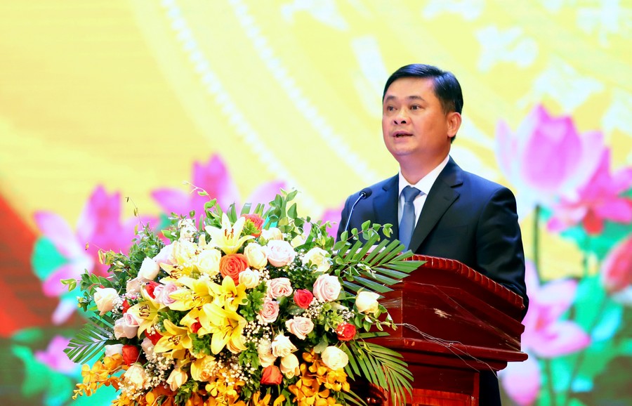 | Đồng chí Thái Thanh Quý, Ủy viên Dự khuyết Trung ương Đảng, Bí thư Tỉnh ủy Nghệ An trình bày diễn văn tại Lễ kỷ niệm. |