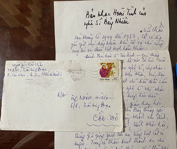 Trong dòng cảm xúc nhớ về cố soạn giả Viễn Châu, soạn giả Nhâm Hùng đã lục tìm và cho chúng tôi xem bức thư viết tay mà cố soạn giả gửi cho ông. Chuyện là khi thực hiện đề tài nghiên cứu về các văn nghệ sĩ Cần Thơ, trong đó có nghệ sĩ Bảy Nhiêu, ông Nhâm Hùng đã liên hệ NSND Viễn Châu để tìm hiểu thêm thông tin. Vậy là NSND Viễn Châu rất sẵn lòng chia sẻ, viết gửi ông lá thư thật dài. Theo nội dung thư, từ khoảng năm 1953, NSND Viễn Châu có dịp gần gũi với cố nghệ sĩ Bảy Nhiêu - ông gọi thân mật là chú Bảy - khi cùng cộng tác ở Đoàn Việt kịch Năm Châu. Ông kể những kỷ niệm với nghệ sĩ Bảy Nhiêu khi cùng sống ở đình Phú Hòa - Tân Định, nơi Đoàn Năm Châu tá túc, cùng với hơn 100 nghệ sĩ trong đoàn.