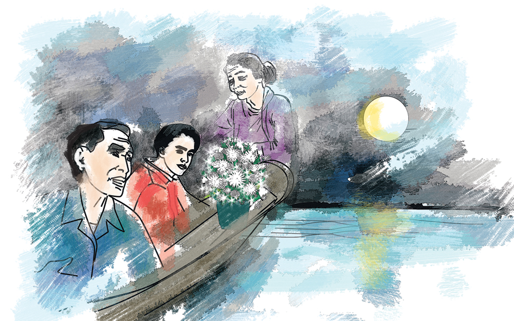 Năm đó, thấy mấy ngọn đèn ở hai bên bờ sông sáng lấp lánh, má tôi suốt ruột nên nói với tía: “Hay năm nay mình về sớm cúng ông bà. Còn mấy chậu bông cúc trắng này, mình đem về cho tụi nhỏ mừng”. Má về với sự nhẹ nhõm trong lòng, bông đã bán xong, mớ tiền kiếm được đủ để lấp đầy những thiếu hụt năm sau. Má gọi điện về nhà: “Má có mua mấy ái áo mới cho hai đứa, bộ ấm trà mới cho nội. Nói nội đừng lo, chừng ba tiếng nữa tía má về tới nhà”…