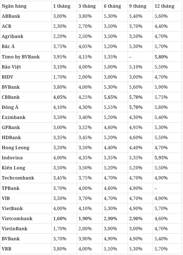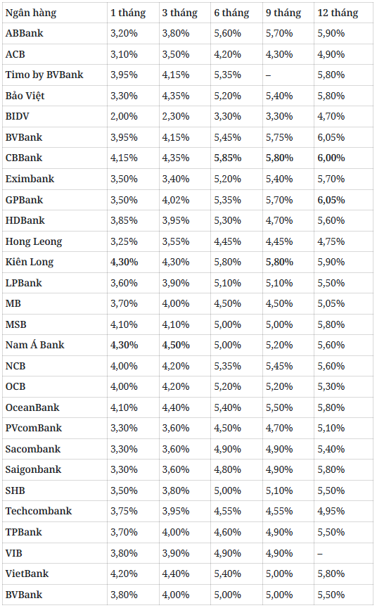 Dưới đây là tổng hợp lãi suất tiền gửi tiết kiệm mới nhất của các ngân hàng.