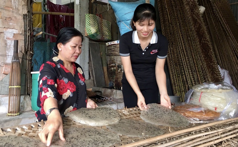 Chị Thanh Cảnh (bên trái) phát triển nghề làm bánh tráng khá thành công, giúp chị tự tin, có cuộc sống ổn định.