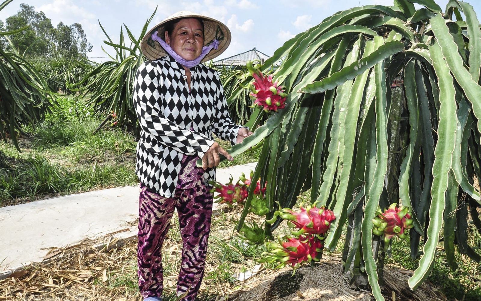 Hai năm nay, bà Nguyễn Thị Sáu, ấp Trường Khương B thu lời từ trồng thanh long ruột đỏ 300 triệu đồng/năm. Ảnh: ANH DŨNG