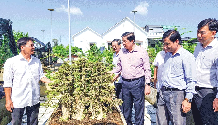 Anh Nhân (trái) giới thiệu về một tác phẩm kiểng bonsai của mình đến đoàn tham quan của thành phố.
