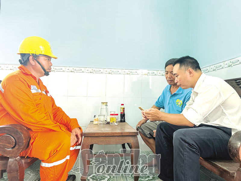 Cán bộ, công nhân ngành điện hướng dẫn người dân ở phường An Thới, quận Bình Thủy cài đặt và sử dụng app của EVNSPC để biết được các dịch vụ điện hiện có.