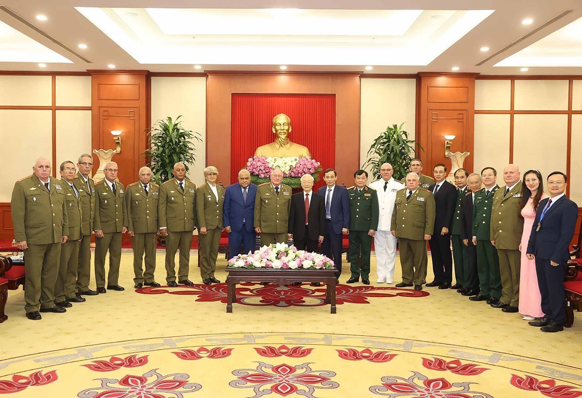 | Tổng Bí thư Nguyễn Phú Trọng và Thượng tướng An-va-rô Lô-pết Mi-ê-ra, cùng các thành viên trong Đoàn Bộ các lực lượng vũ trang Cách mạng Cu-ba |