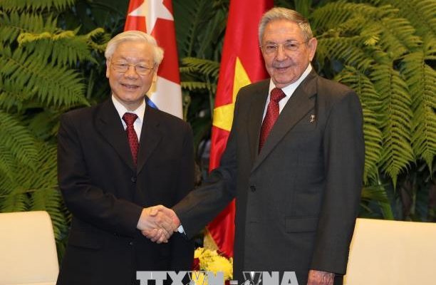 | Tổng Bí thư Nguyễn Phú Trọng và đồng chí Raul Castro Ruz, Bí thư thứ nhất Ban Chấp hành Trung ương Đảng Cộng sản Cuba, (tháng 3/ 2018). (Ảnh: Trí Dũng/TTXVN) |