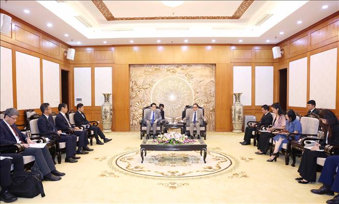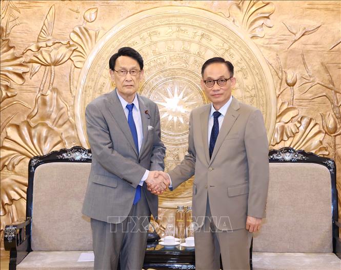 | Trưởng Ban Đối ngoại Trung ương Lê Hoài Trung tiếp Trưởng Ban nghiên cứu chính sách Đảng Dân chủ Tự do Nhật Bản Tokai Kisaburo. (Ảnh: TTXVN) |