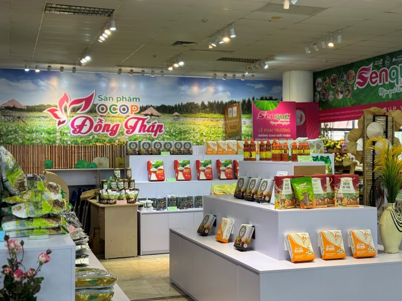 | Không gian sản phẩm OCOP Đồng Tháp tại Trung tâm xúc tiến thương mại nông nghiệp, địa điểm diễn ra chương trình (Ảnh: HNV) |