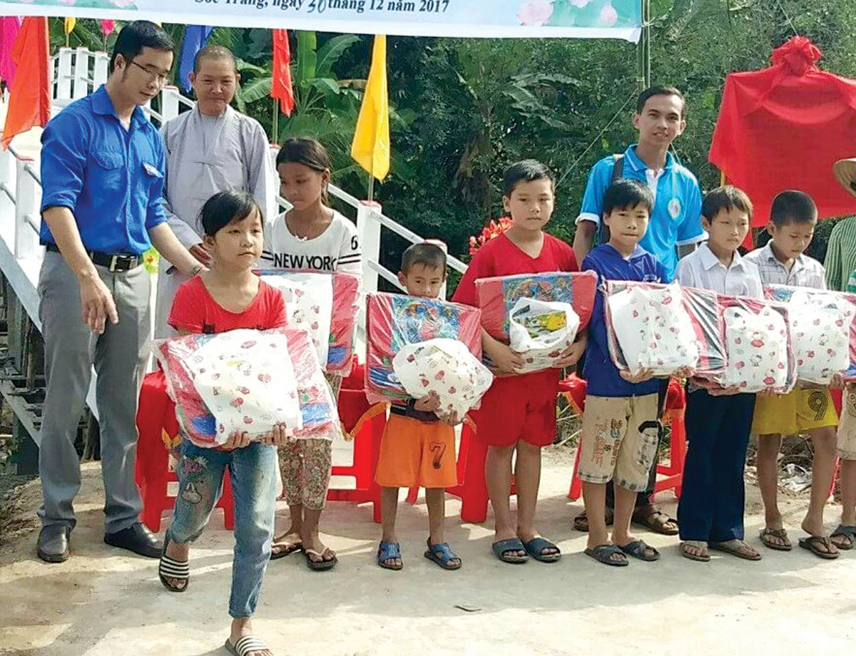 Huỳnh Thanh Sang (hàng sau, bìa phải), sinh viên Trường Đại học Cần Thơ tặng quà cho trẻ em nghèo tại huyện Kế Sách, tỉnh Sóc Trăng vào dịp cuối năm 2017. Ảnh: CTV
