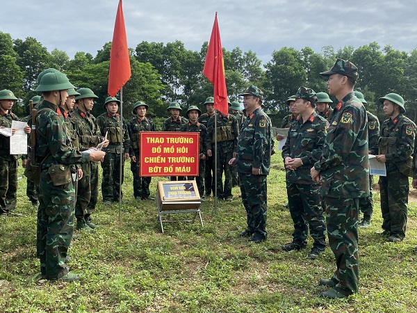 | Thủ trưởng Sư đoàn 346 và cán bộ Trung đoàn 677 động viên chiến sĩ mới tại thao trường. |