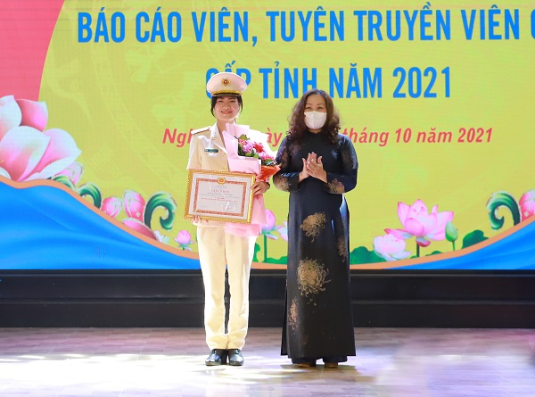 | Đồng chí Nguyễn Thị Thu Hường, Trưởng Ban Tuyên giáo Tỉnh ủy Nghệ An, Trưởng ban Tổ chức Hội thi trao giải Nhất cho thí sinh Trần Thị Thanh Huyền. (Ảnh: Thanh Lê). |