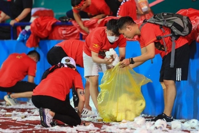 | Ngoài công tác tuyên truyền bảo vệ môi trường, các tình nguyện viên luôn tích cực tiến hành thu gom rác thải, bảo vệ môi trường sau mỗi trận đấu. (Ảnh: Nguyễn Dũng). |