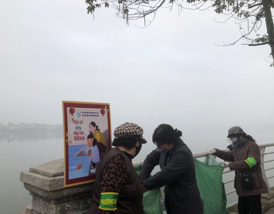 Nắm bắt được khu vực xung quanh hồ Tây sẽ là nơi khá đông người dân chọn là nơi thả cá, Hội Liên hiệp phụ nữ quận Tây Hồ đã cử cán bộ, hội viên dựng biển cũng như thường xuyên trực, nhắc nhở người dân thả cá không thả túi nilon, bỏ rác đúng nơi quy định. Nhờ vậy, nhiều người dân đi thả cả đã để túi nilon đúng nơi quy định hoặc chủ động sử dụng các dụng cụ không phát sinh ra rác thải như nồi, chậu, bát… để đựng cá.