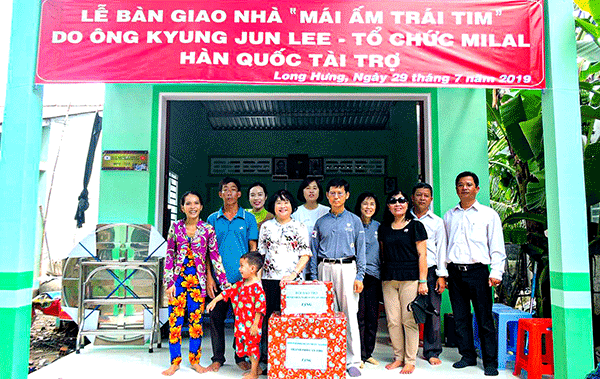 Bà Trần Cẩm Hồng, Chủ tịch Hội Bảo trợ Bệnh nhân nghèo TP Cần Thơ (thứ 4 từ trái qua) cùng ông Kyung Jun Lee, đại diện tổ chức Milal (đứng cạnh bà Hồng) dự Lễ bàn giao mái ấm trái tim cho bệnh nhân mổ tim ở quận Ô Môn.