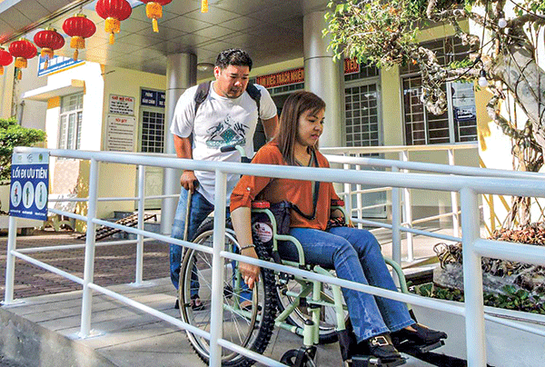 Hội viên NKT di chuyển trên đường dốc tiếp cận do tổ chức Liên minh Na Uy tài trợ xây dựng tại trụ sở UBND phường An Nghiệp, quận Ninh Kiều.