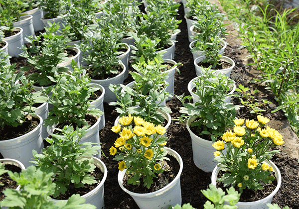 Nơi đây trồng chủ yếu các giống hoa truyền thống: vạn thọ, cúc mâm xôi, cúc Tiger, cát tường... Bên cạnh đó, năm nay có thêm một số giống hoa mới: ly Hà Lan, lan tím, cúc lùn (ảnh), cúc pico...