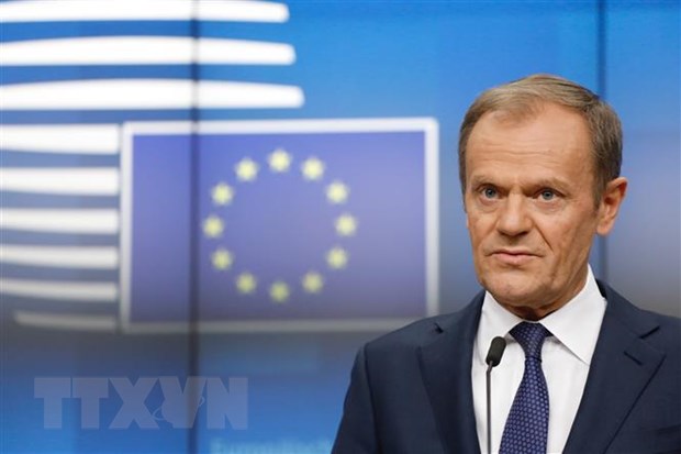 Chủ tịch Hội đồng châu Âu Donald Tusk trong cuộc họp báo tại Brussels, Bỉ ngày 22/3/2019. (Ảnh: THX/TTXVN)