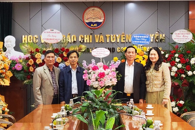 | TS Nguyễn Công Dũng, Tổng Biên tập Báo điện tử Đảng Cộng sản Việt Nam cùng cán bộ của Báo chúc mừng Học viện Báo chí và Tuyên truyền. Ảnh: TL. |