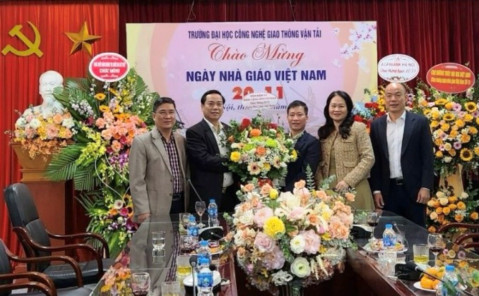 | TS Nguyễn Công Dũng, Tổng Biên tập Báo điện tử Đảng Cộng sản Việt Nam cùng cán bộ của Báo tặng hoa chúc mừng Trường Đại học Công nghệ Giao thông vận tải. Ảnh: TL. |