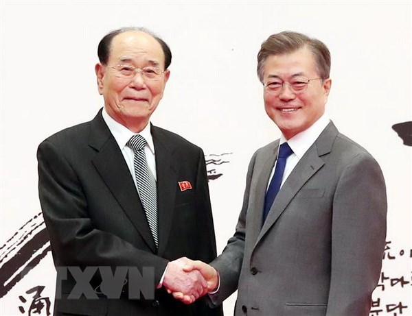 Chủ tịch Quốc hội Triều Tiên Kim Yong-nam (trái) và Tổng thống Hàn Quốc Moon Jae-in tại Nhà Xanh ngày 10/2. (Nguồn: Yonhap/TTXVN)