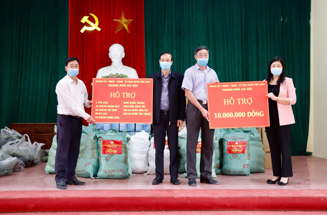 | Lãnh đạo Thành phố Hà Nội trao quà hỗ trợ cho xã Dũng Tiến, huyện Thường Tín. |