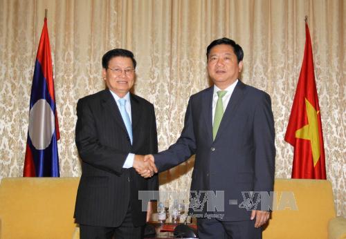 Bí thư Thành ủy Đinh La Thăng với Thủ tướng Thongloun Sisoulith. Ảnh: Thanh Vũ/TTXVN