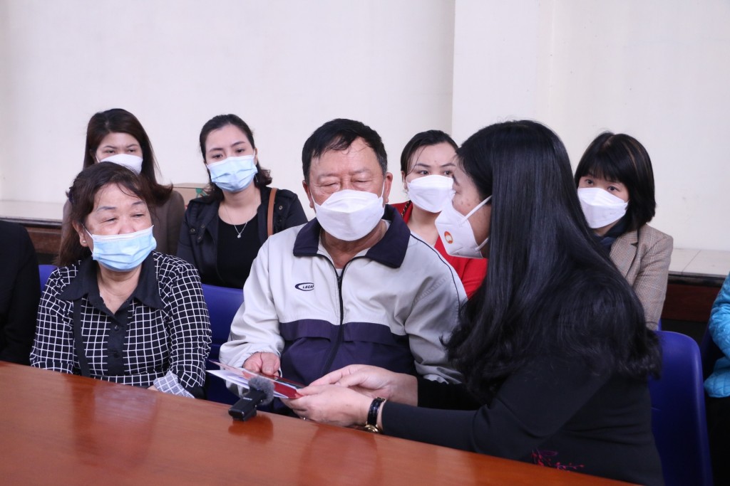 | Chủ tịch Ủy ban MTTQ Việt Nam TP Hà Nội Nguyễn Lan Hương trao hỗ trợ cho gia đình gặp nạn trong vụ cháy. |