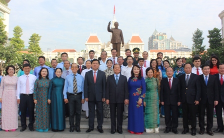 Đoàn lãnh đạo TP.Hồ Chí Minh tiếp tục đến dâng hoa tại Tượng đài Chủ tịch Hồ Chí Minh (trước trụ sở UBND Thành phố). Lẵng hoa của đoàn mang dòng chữ “Đời đời nhớ ơn Chủ tịch Hồ Chí Minh vĩ đại”.