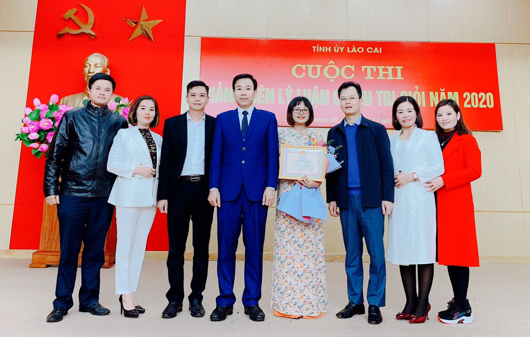 | Đ/c Dương Đức Huy - UVBTV, Trưởng Ban Tuyên giáo Tỉnh ủy Lào Cai (thứ 4 từ trái sang) chụp ảnh lưu niệm cùng lãnh đạo huyện ủy, TTCT huyện Văn Bàn tại lễ trao giải cuộc thi giảng viên lý luận chính trị giỏi năm 2020. |