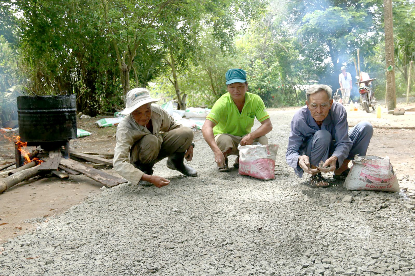Bác Hai Phong (bìa phải) cần mẫn làm đường thiện nguyện ở tuổi 82.