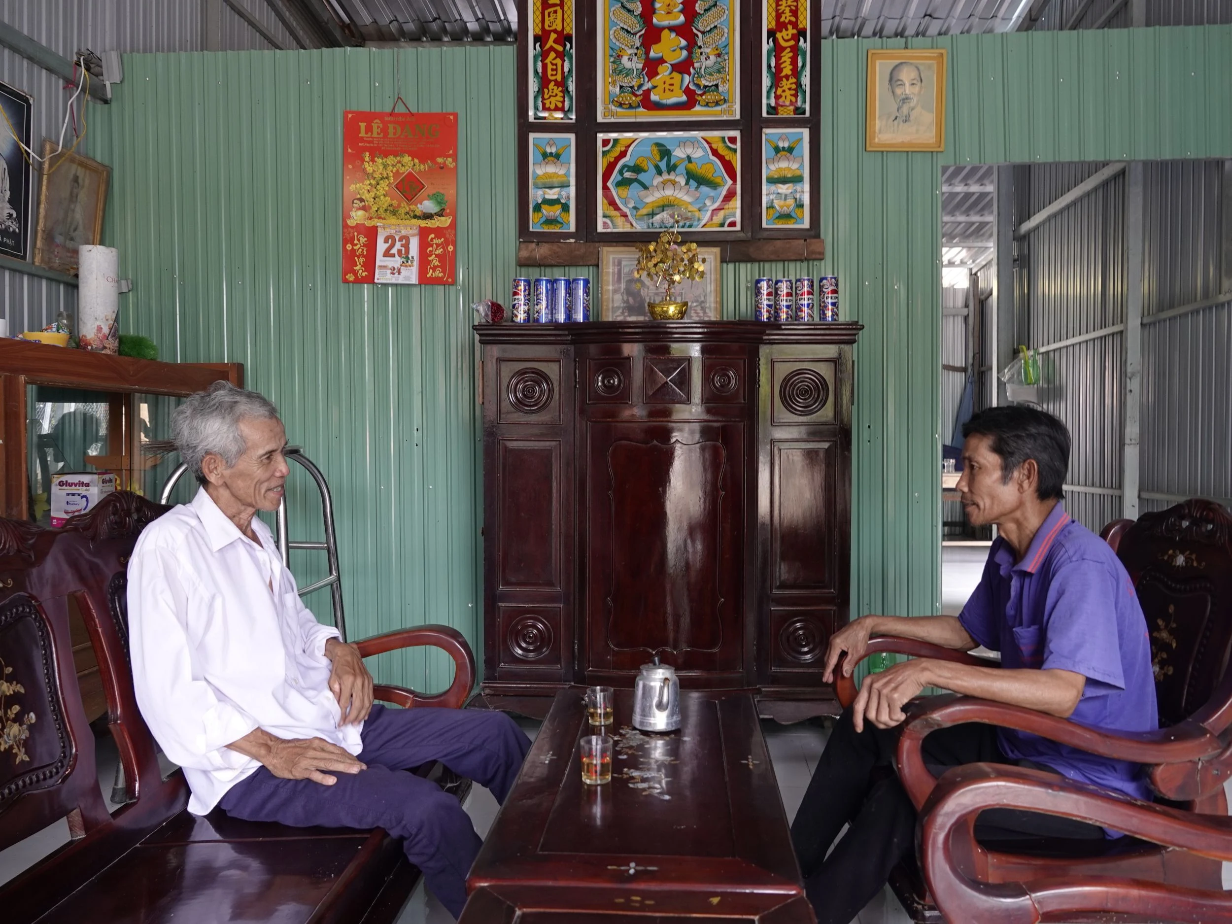 Ông Phạm Văn Bên (bên trái) thăm hỏi cuộc sống của gia đình anh Nguyễn Văn Tám ở khu vực Tân Hưng.