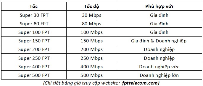 Nhu cầu sử dụng mạng internet tốc độ cao của các hộ kinh doanh, công ty, văn phòng, phòng game, doanh nghiệp.... quy mô vừa và nhỏ là rất lớn. Mạng FPT telecom đáp ứng được điều đó. Với nhóm đối tượng này, FPT Long An đã triển khai 4 gói cước, gồm Super 200, Super 250, Super 400 và Super 500. Tùy vào nhu cầu sử dụng mà khách hàng có lựa chọn hợp lý nhằm tiết kiệm tối đa chi phí mà vẫn đảm bảo chất lượng công việc hàng ngày.