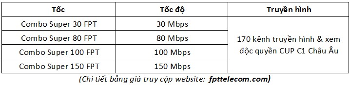 Nhằm đáp ứng nhu cầu sử dụng mạng internet của các cá nhân, gia đình; hộ kinh doanh quy mô nhỏ... FPT Telecom Long An đã tung ra nhiều gói cước với mức giá cực kỳ ưu đãi cùng nhiều khuyến mãi đi kèm. Nổi bật nhất trong đó là 3 gói cước Super 80, Super 100 và Super 150.