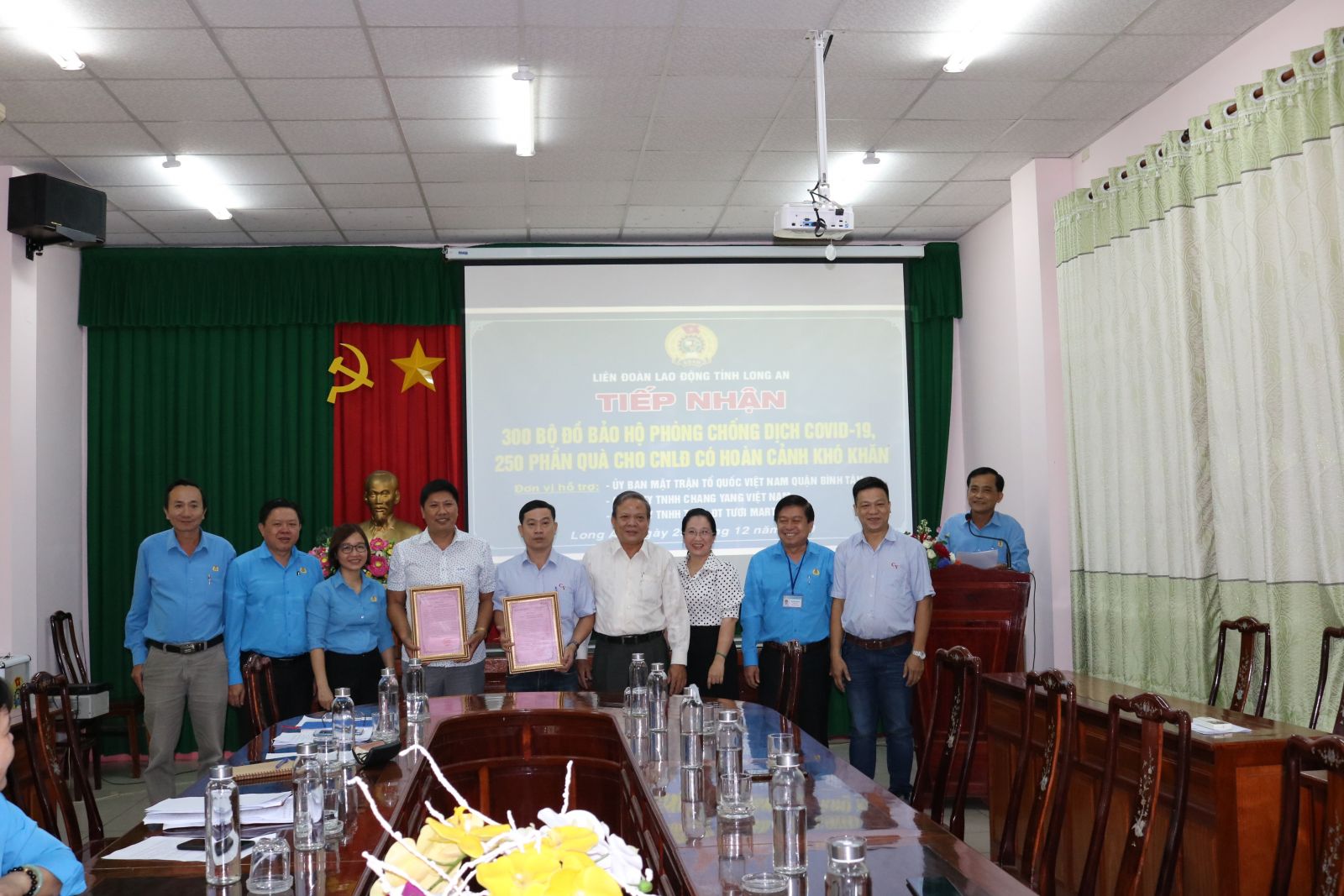 Trên tinh thần đó, LĐLĐ tỉnh Long An đã mời gọi và nhiệt liệt đón chào các nhà tài trợ đến từ TP.HCM góp phần cùng LĐLĐ tỉnh Long An phòng, chống dịch bệnh trong CNLĐ và tặng quà cho CNLĐ dịp tết. Tại cuộc tiếp nhận, các nhà tài trợ từ TP.HCM (UBMTTQVN quận Bình Tân và các doanh nghiệp) đã trao 300 bộ đồ bảo hộ phòng, chống dịch Covid-19 và 250 phần quà cho CNLĐ có hoàn cảnh khó khăn đón tết.