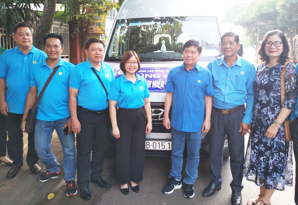 Chủ tịch LĐLĐ tỉnh - Nguyễn Văn Quí (thứ 3 từ phải sang) cùng đoàn cán bộ Công đoàn lên đường cứu trợ đồng bào miền Trung bị ảnh hưởng do bão, lũ