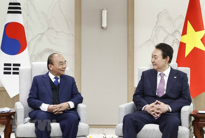 | Chủ tịch nước Nguyễn Xuân Phúc và Tổng thống Yoon Suk-yeol. (Ảnh: Thống Nhất/TTXVN) |