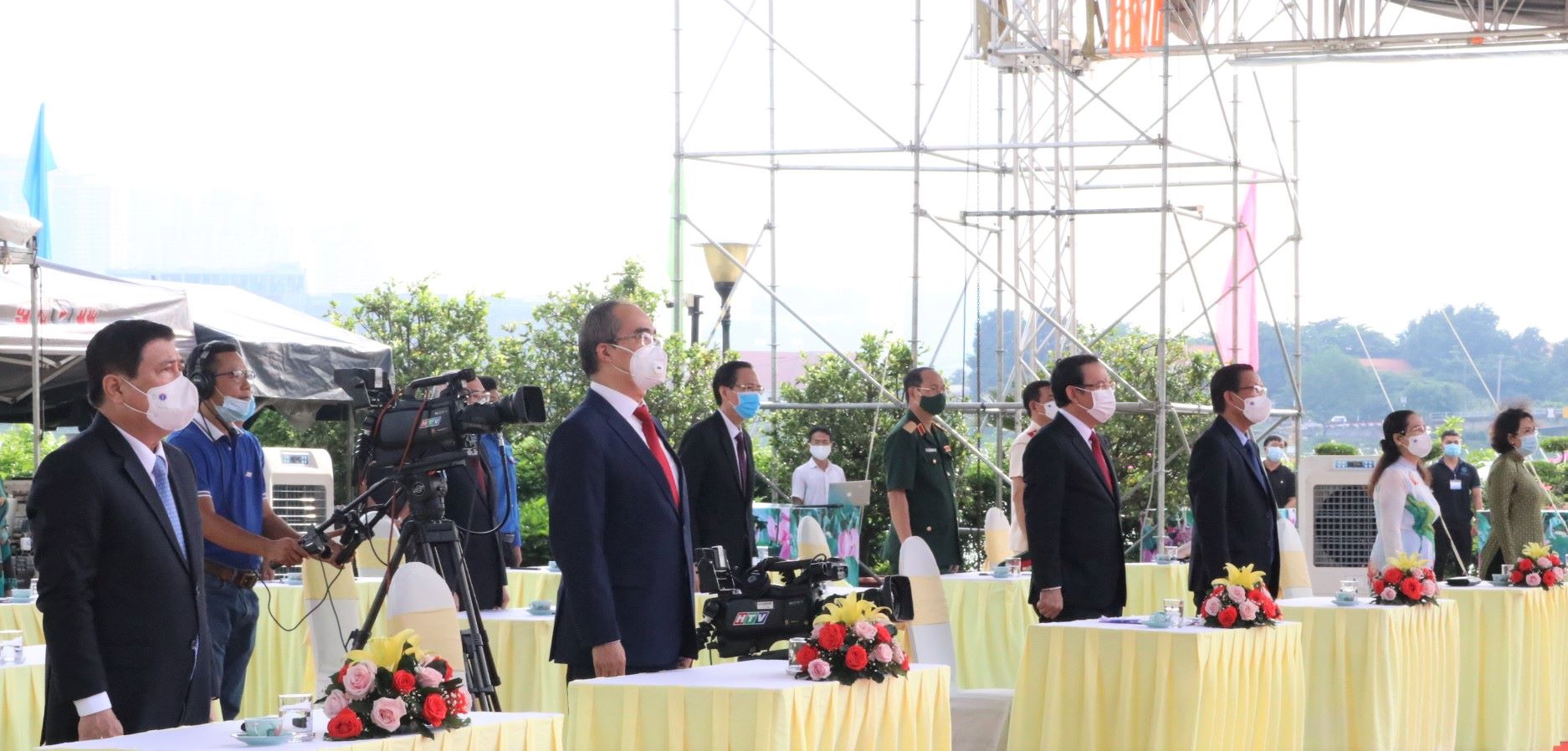 | Các đồng chí lãnh đạo thực hiện nghi thức chào cờ (Ảnh: HM) |