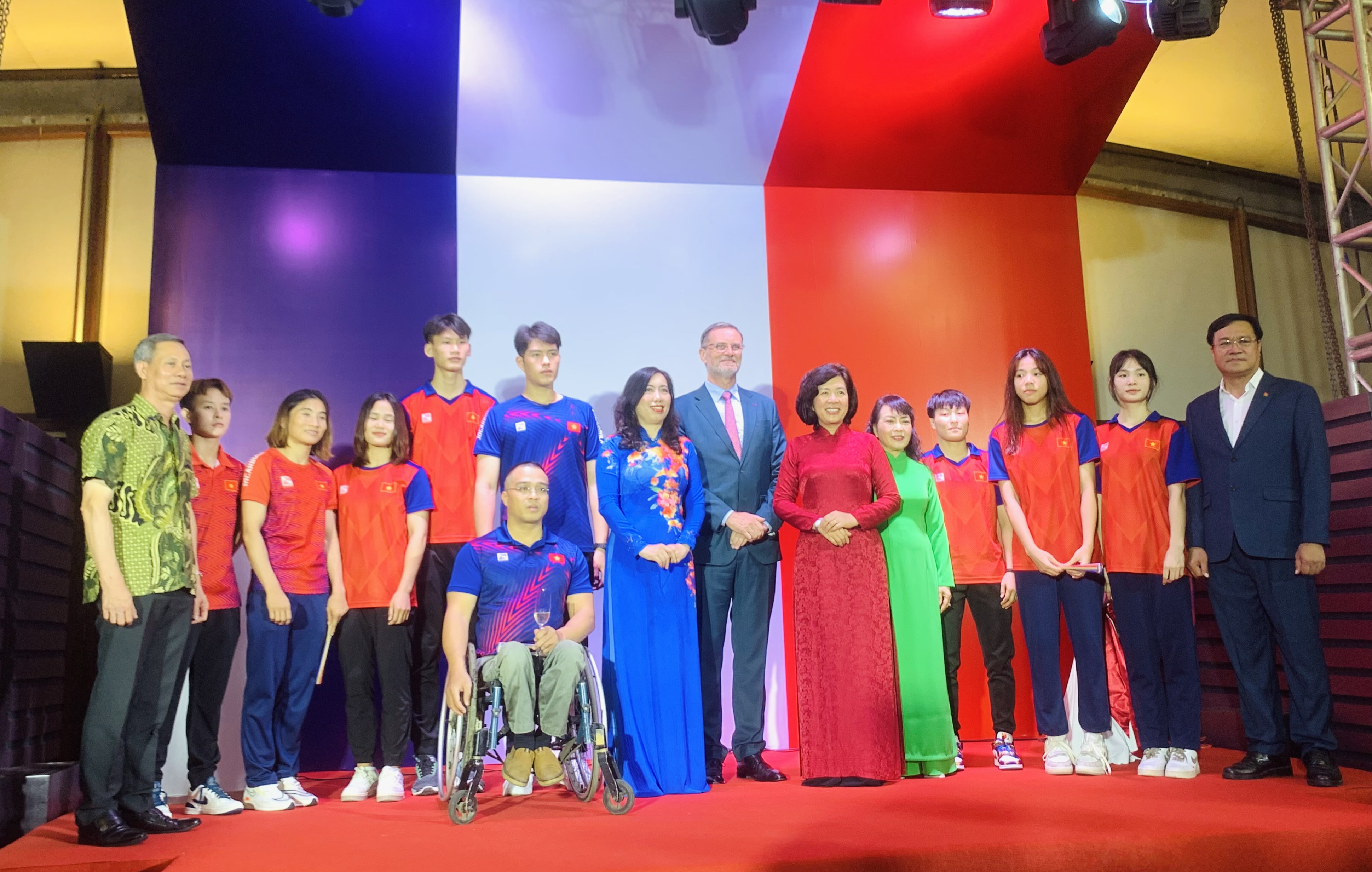 | Thứ trưởng Lê Thị Thu Hằng, Đại sứ Olivier Brochet và các đại biểu chụp ảnh cùng các vận động viên của Việt Nam chuẩn bị lên đường tham dự Olympic và Paralympic Paris 2024. |